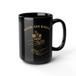 A black ceramic mug stamped with the bold affirmation “Good Ass Karma.”